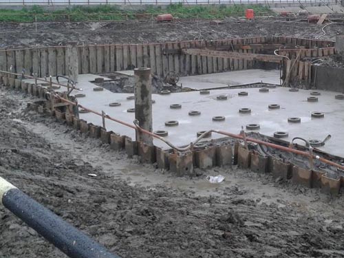 7)在基礎(chǔ)溝槽開挖中,隨時(shí)觀察鋼板樁的變化情況,若有明顯的傾覆或隆卝起狀態(tài),立即在傾覆或隆卝起的部位對稱支撐。